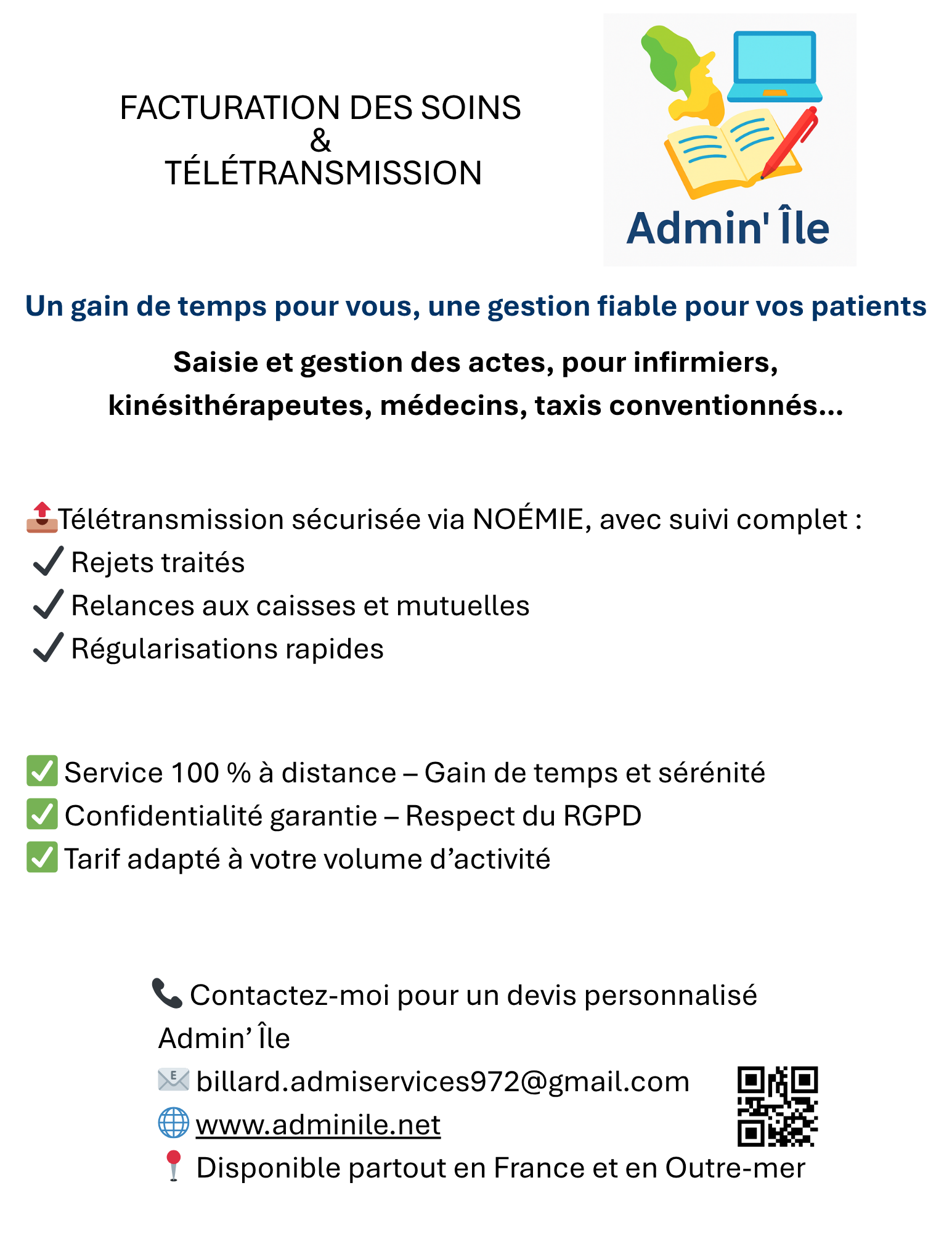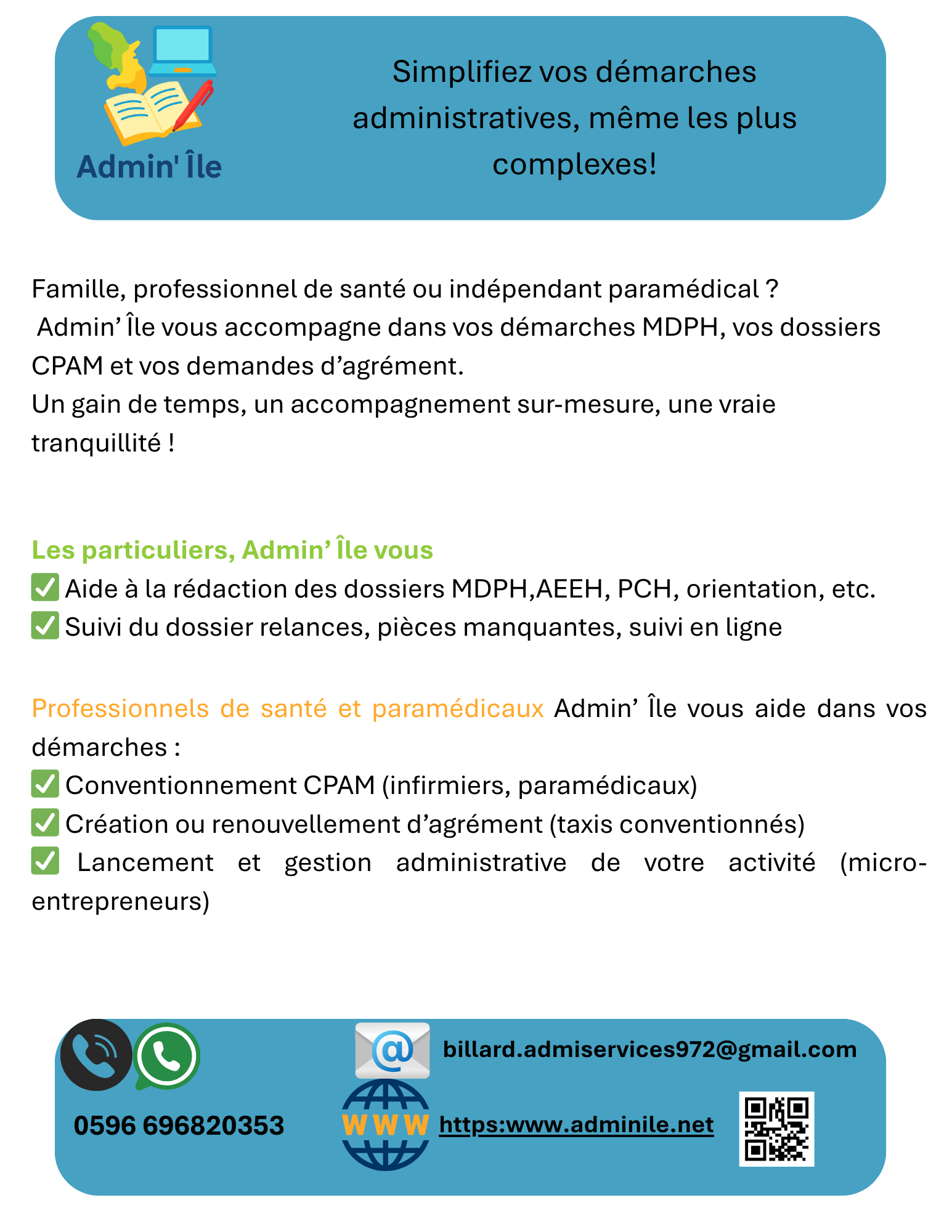 Créée et dirigée par une assistante expérimentée du secteur médico-social, Admin’ Île propose des solutions administratives sur-mesure aux professionnels de santé, aux structures médico-sociales, aux indépendants et aux familles.